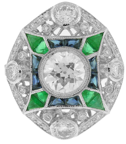 Platinum antique style ring with 1.00ct old euro diamonds, sapphires, and emeralds