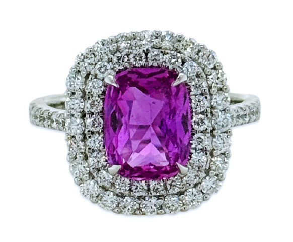 18kt white gold cushion pink sapphire halo diamond ring