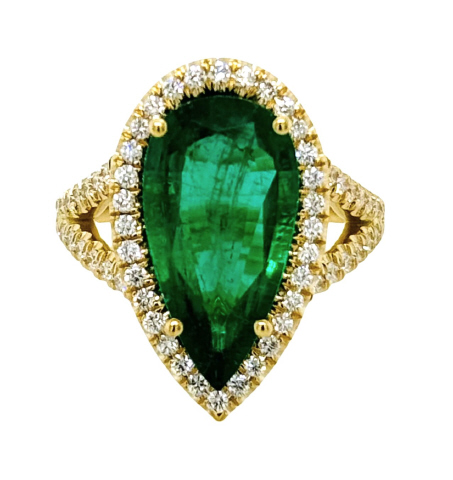 18kt yellow gold pearshape emerald and diamond halo split shank ring