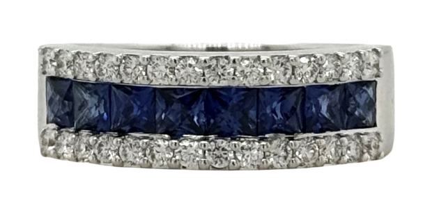18kt white gold carre cut sapphire and diamond band.
