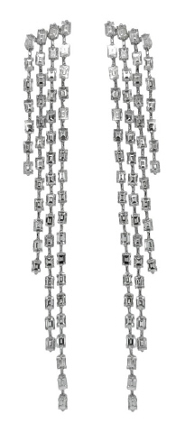 18kt white gold 4-strand baguette diamond dangle earrings.