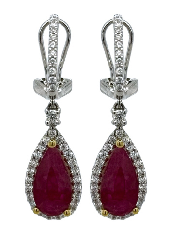 18kt white gold pearshape ruby diamond halo hanging earrings
