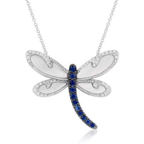 18kt white gold sapphire, diamond and mother of perl drangonfly pendant with chain.