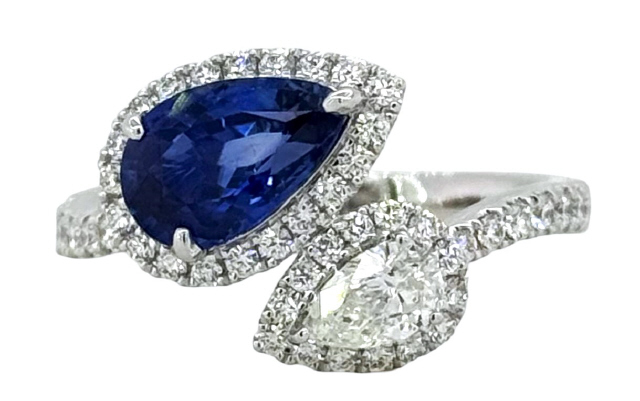 18kt white gold pearshape sapphire and diamond by pass halo ring