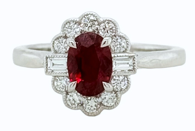 Oval Ruby .83ct Round Diamonds 10/.24tw G-H/VS2-SI1 Baguette Diamonds 2/.12tw G-H/VS2-SI1 (Top measures 11.65 x 10.35mm : Shank in back measures 7.85mm)