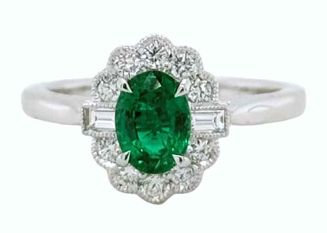 Oval Emerald .72ct Round Diamonds 10/.25tw G-H/VS2-SI1 Baguette Diamonds 2/.13tw G-H/VS2-SI1 (Top measures 11.7 x 10.4mm : Shank in back measures 7.85mm)