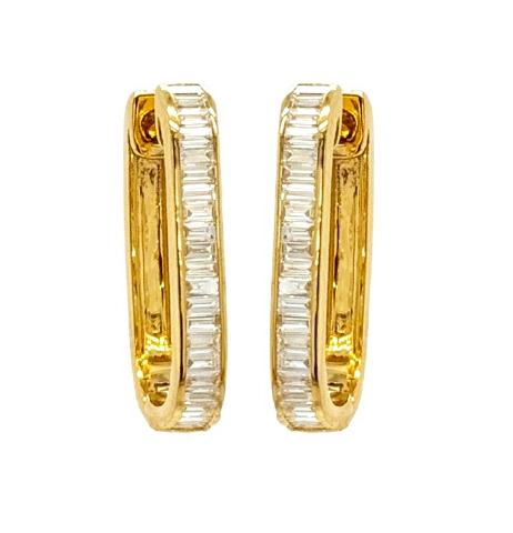 18kt yellow gold channel set rectangular baguette diamond hoop earrings.