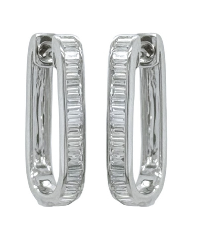 18kt white gold channel set rectangular baguette diamond hoop earrings.