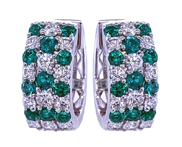 18kt white gold emrald and diamond 3-row huggie hoop earrings.