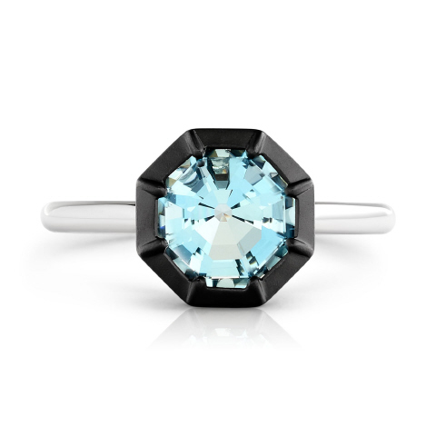 18kt white gold aquamarine ring with satin finish black rhodium.