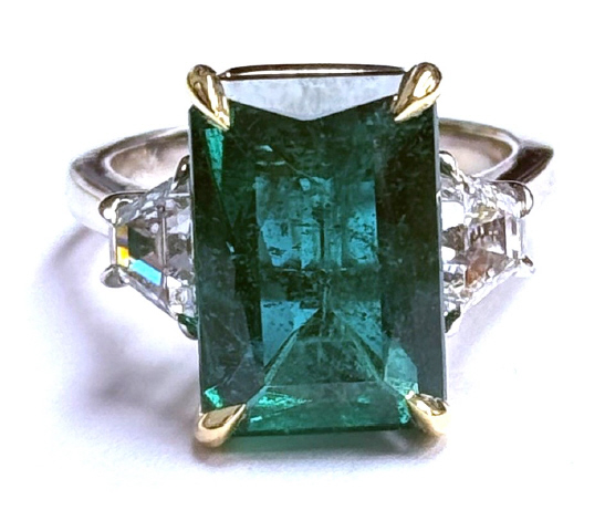 Emerald cut emerald 7.70ct GIA #1232510866 14.31 x 9.71 x 6.90mm Trapezoid Diamonds 2/1.04tw E-F/VS1-VS2, 6.7 x 3.45 x 3.92mm