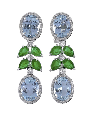 Platinum oval aqua, pearshape emeralds and diamond hanging earrings