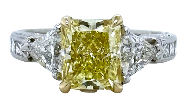 Radiant yellow diamond 2.67ct Natural, fancy yellow, Even VS1 8.00 x 6.82 x 5.17mm Trillion diamonds 2/0.92tw G-H/VS2-SI1+ Princess cut diamonds 8/0.45+/- G-H/VS2-SI1+ Size 6.5