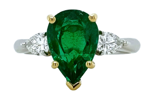 Platinum and 18kt yellow gold pearshape emerald and diamond ring