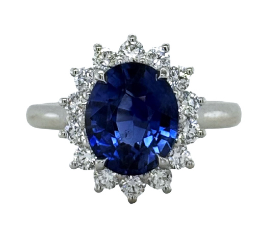 Platinum oval sapphire and diamond halo ring