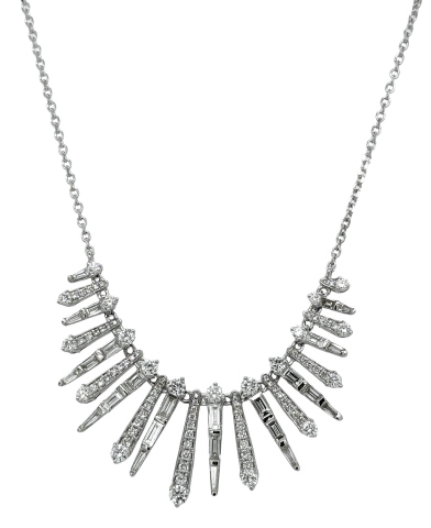 18kt white gold round and baguette diamond spike necklace. 16"-18"