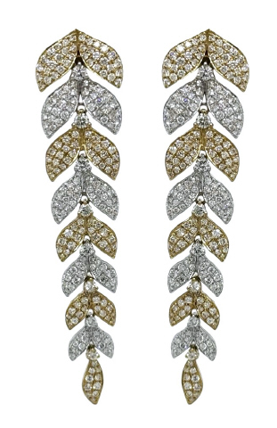 18kt two tone pave diamond leaf style graduated diamond dangle earrings.