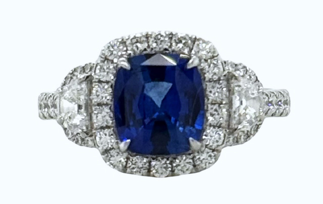 Cushion sapphire 1.66ct Round and step cut half moon diamonds 48/0.87tw G-H/VS2-SI1 size 6.75
