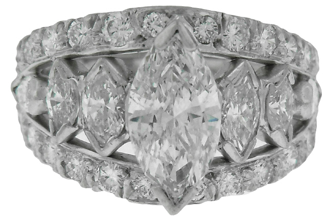 Marquise diamond=1/.75ct+/- G-H SI2 Marquise diamonds=6/.75tw+/- F-G VS Round diamonds=36/.50tw+/- F-G VS