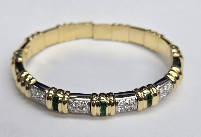 18kt two tone emerald and diamond flex cuff bangle bracelet.