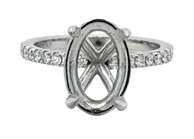 Platinum diamond semi-mount to hold 13 x 9+/-mm center oval stone.