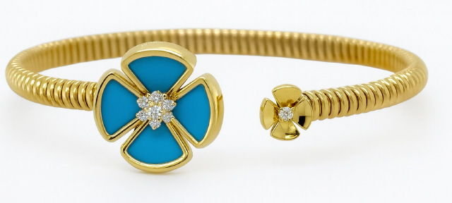 18kt yellow gold turquoise and diamond flex cuff bangle bracelet. 6.5"