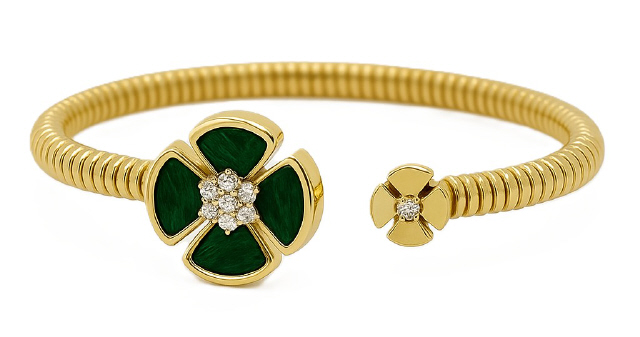 18kt yellow gold malachite and diamond flex cuff bangle bracelet. 6.5"