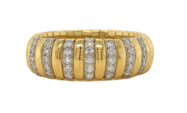 18kt yellow gold wide stretch ring with diamond bars. Size 6.25.