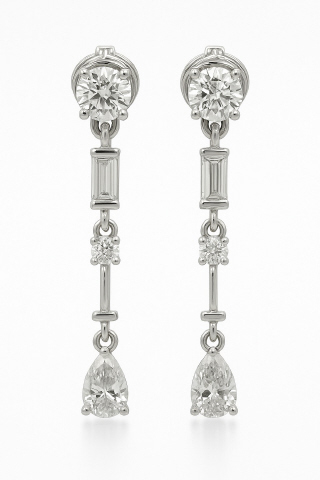 14kt white gold round, baguette and pearshape hanging earrings
