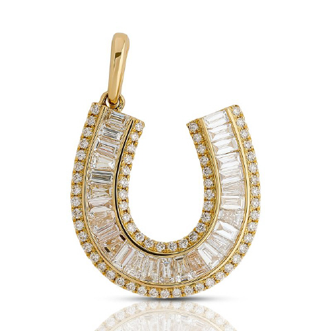 14kt yellow gold round and baguette diamond horseshoe charm with snap bail.
