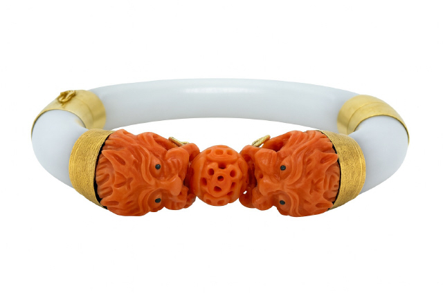 14kt yellow gold jade and coral head bangle