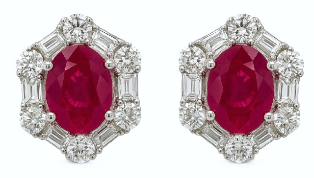 Oval rubies 2/2.07tw Round diamonds 12/0.53tw Baguette diamonds 12/0.44tw G-H/VS2-SI1