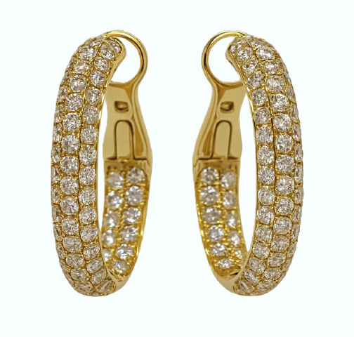 18kt yellow gold 3 row pave diamond inside outside oval hoop earrings