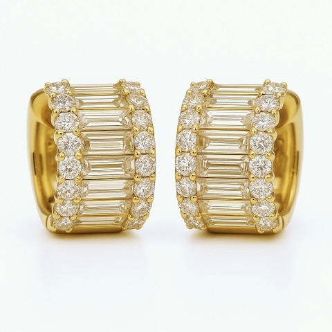 18kt yellow gold round and baguette diamond huggie earring