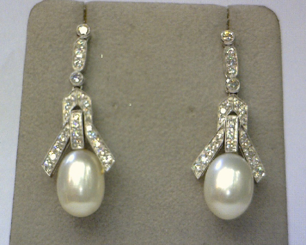Platinum pearl and diamond hanging earrings