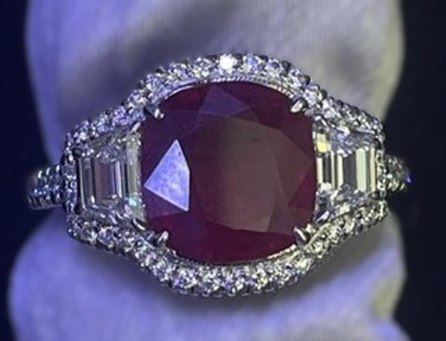 Cushion ruby 2.75ct Report#160738 8.98 x 8.69 x 3.79mm Round diamonds 0.28tw G-H/VS2-SI1 Trap diamonds 0.58tw G-H/VS2-SI1 Size 6.5