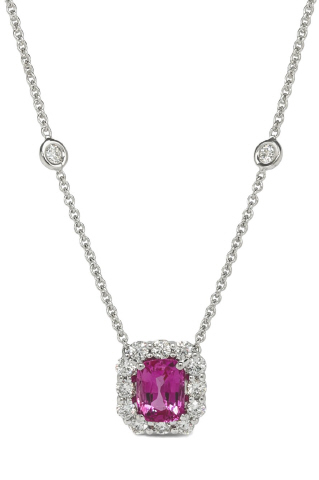 18kt white gold cushion pink sapphire, diamond halo pendant with diamond by the yard chain