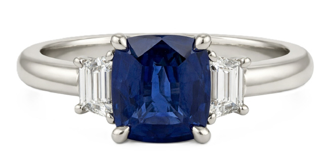 Platinum cushion sapphire and traps diamond ring