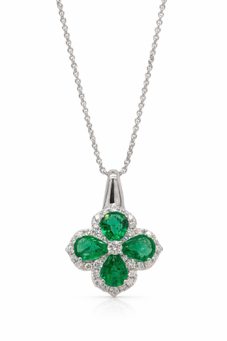 Pearshape emeralds 4/0.99tw Round diamonds 37/0.28tw G-H/VS2-SI1 Lenght 18" Pendant measures 13.70mm x19.84mm