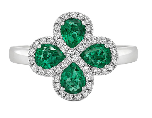 Pearshape emeralds 4/1.08tw Round diamonds 41/0.28tw G-H/VS2-SI1 Size 7