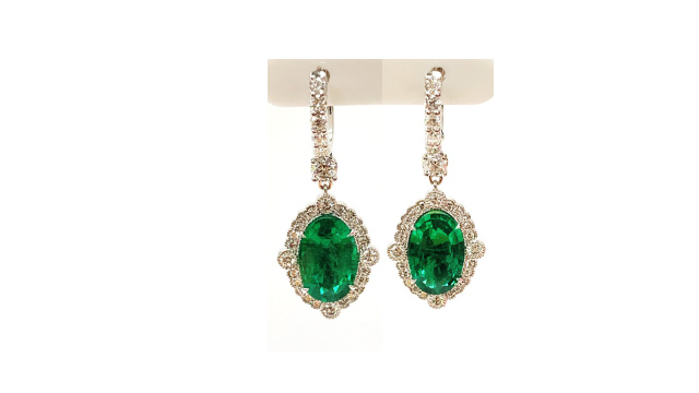 Oval emeralds 2/5.46tw Round diamonds 60/1.47tw G-H/VS2-SI1 Lenght 1 3/8"
