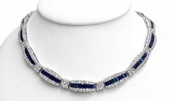 14kt white gold baguette sapphire and diamond necklace