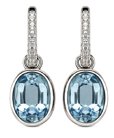 18kt white gold hanging bezel set aqua earrings with 3-row pave diamond hoop tops.