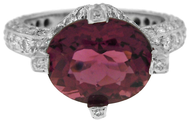 Oval pink tourmaline=1/4.08cts Round diamonds=110/1.73tw E-F VS