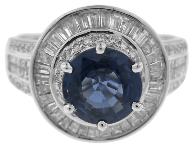 Sapphire 1.50ct Tapered baguette diamonds 24/0.50tw Round diamonds 40/0.20tw Princess cut diamonds 20/0.30tw G-H/SI1