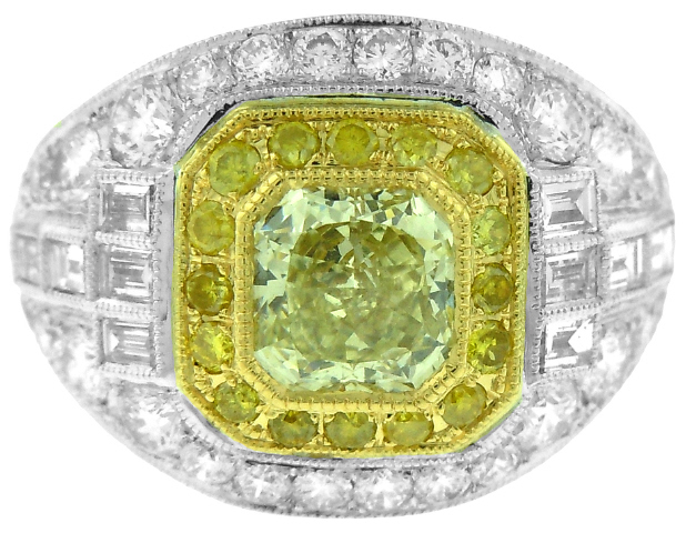 Square radiant cut diamond=1/1.01cts Y-Z SI1 GIA5151631393 5.92x5.76x3.51mm 60.9D 68T G/G N Yellow diamonds=16/.24tw Round and baguette diamonds=40/1.42tw E-F VS