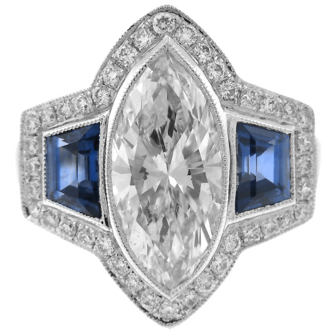 Marquise Diamond 2.53ct K-SI1 EGL Report #US 68478001D Trap Sapphires 2/1.07tw Round Diamonds 40/.34tw G-H/VS2-SI1