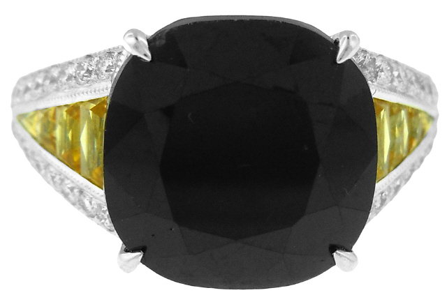 Platinum ring with cushion sapphire, diamonds, and yellow sapphires