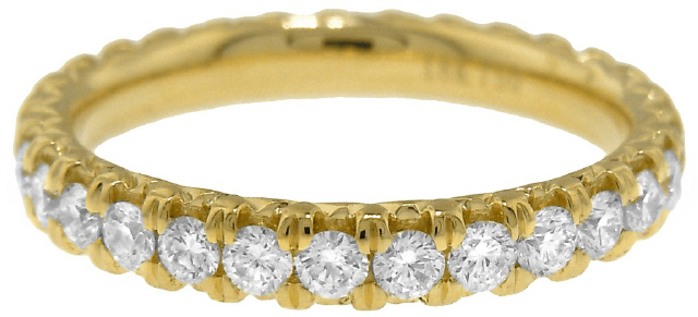 18kt yellow gold shared prong diamond eternity band.
