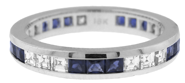 18kt white gold square diamond and sapphire channel set eternity band
